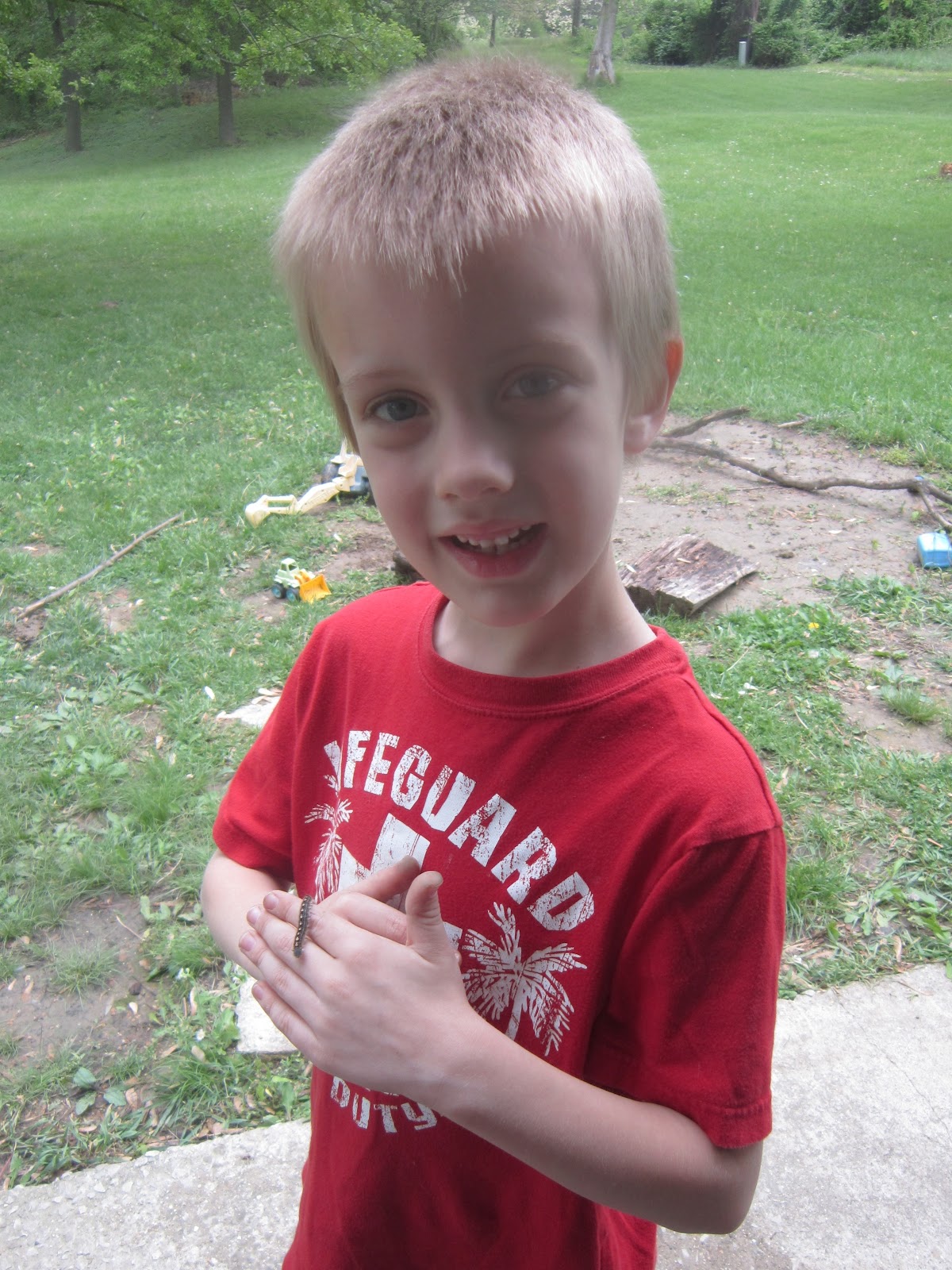 Outside there was a huge stone caterpillar that they boys could play on.