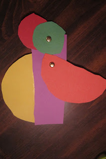 - 1. Cut out the shapes as shown from the card stock. Use a ruler to cut a purple body 6x1.5 inches. Use a compass to cut a circle for the orange wing and yellow belly with a 5 inch diameter and then cut the circles in half. Use a compass to cut a circle for the green head and red beak with a 2 inch diameter.